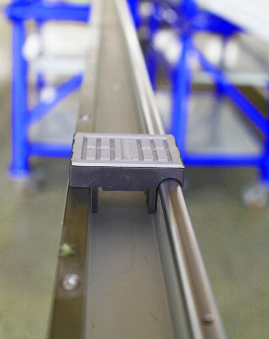 Круглая направляющая конвейера закалена и имеет высокую твердость и износостойкость. Основание башмака конвейера примыкает к направляющей практически без зазоров, гарантируя плавность и ровность хода. Посадочное место для направляющей фрезеруется на прецизионных станках с ЧПУ, поэтому её срок службы практически не ограничен.