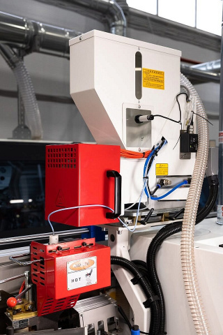 Инфракрасная лампа с рабочей температурой около 300° прогревает торец детали для наилучшего приклеивания кромки. Особенно актуально в зимний период.