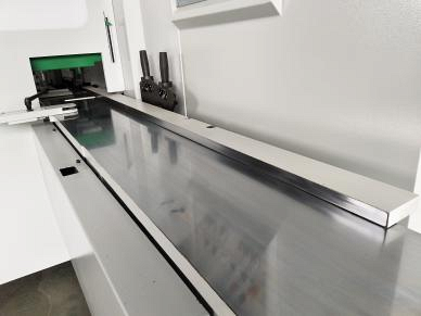 Прижимная балка станка изготовлена из массивного профиля, к которому крепятся верхние агрегаты системы подачи заготовок. Подобная конструкция предусматривает стабильную работу и надежность даже при больших нагрузках.