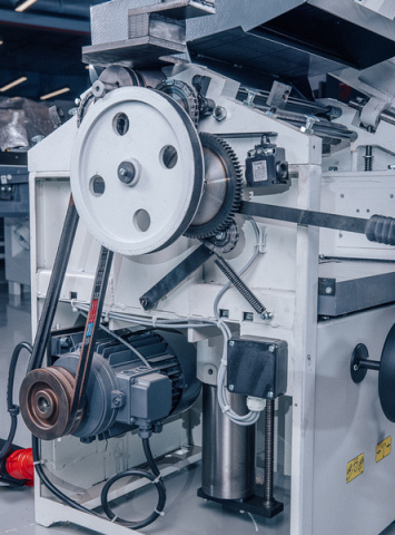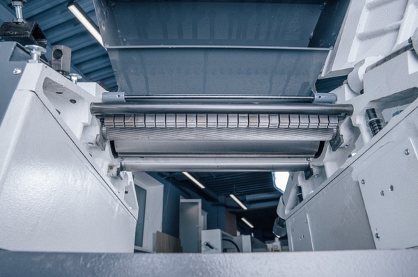 Подача заготовки при помощи рифленого вала с косыми насечками. На выходе гладкий стальной вал. Когтевая защита предотвращает выброс заготовки.