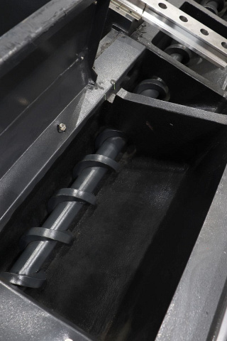 Для удаления отработанной стружки из зоны резания используется автоматически винтовой двойной конвейер (шнек), который не только извлекает стружку, но и отжимает отработанную СОЖ в встроенный бак под конвейером. Конвейер включается через M-код или напрямую от с пульта управления. С помощью настроек устанавливается интервал и продолжительность работы конвейера для автоматического цикла работы. В комплекте поставляется тележка (корзина) для сбора стружки.