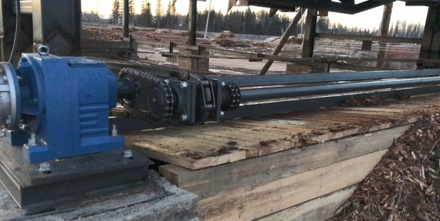 ![]() | Цепной транспортер – бревнотаска Состоит из 2-х частей: Транспортеры укомплектованы двусторонним отбойником для бревен для гашения колебаний бревна в процессе движения. Отбойник зашит листом толщиной 4 мм, необходимой электрикой и датчиками для автоматической работы совместно с загрузочной эстакадой. Металлоконструкции для установки на фундамент Заказчика входят в комплект поставки. Приводные и натяжные станции имеют удобное для обслуживания расположение. |