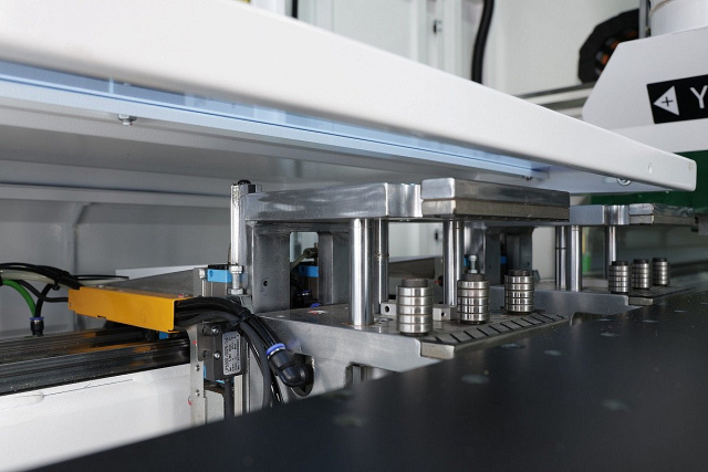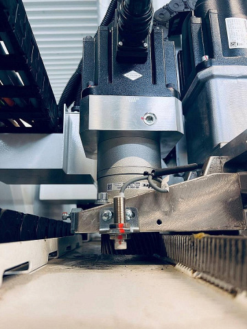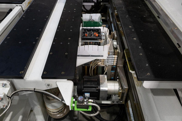![]() | Зажимы Два независимых зажима развивают максимальную скоростью перемещения до 135 м/мин, при помощи серводвигателей INOVANCE и редукторов SHIMPO-NIDEC, которые позволяют производить обработку с высочайшей точностью и скоростью. Позиционирование деталей производится при помощи тройного упора на каждом из захватов. Упоры выполнены в виде подшипников, которые предотвращают скалывание по торцу заготовки, при базировании. Функция автоматического обдува кромки (специальные форсунки), позволяет очистить поверхность нижней части захватов и рабочего стола от возможного мусора и пыли. |