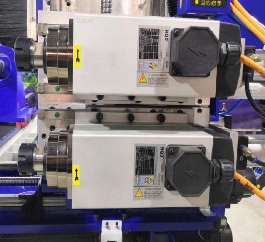 На станке их два, разной мощности 7,5 кВт и 6 кВт, это позволяет делать фрезеровку различной сложности и больших съемов древесины. Работа двумя разными инструментами позволяет не останавливаться на их смену и значительно сокращает время изготовления деталей.